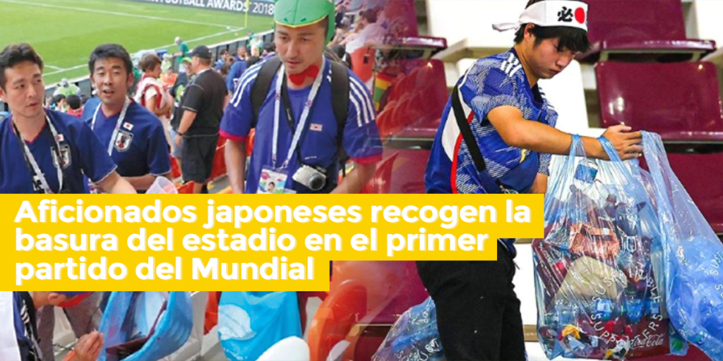 Aficionados japoneses recogen la basura del estadio en el primer partido del Mundial